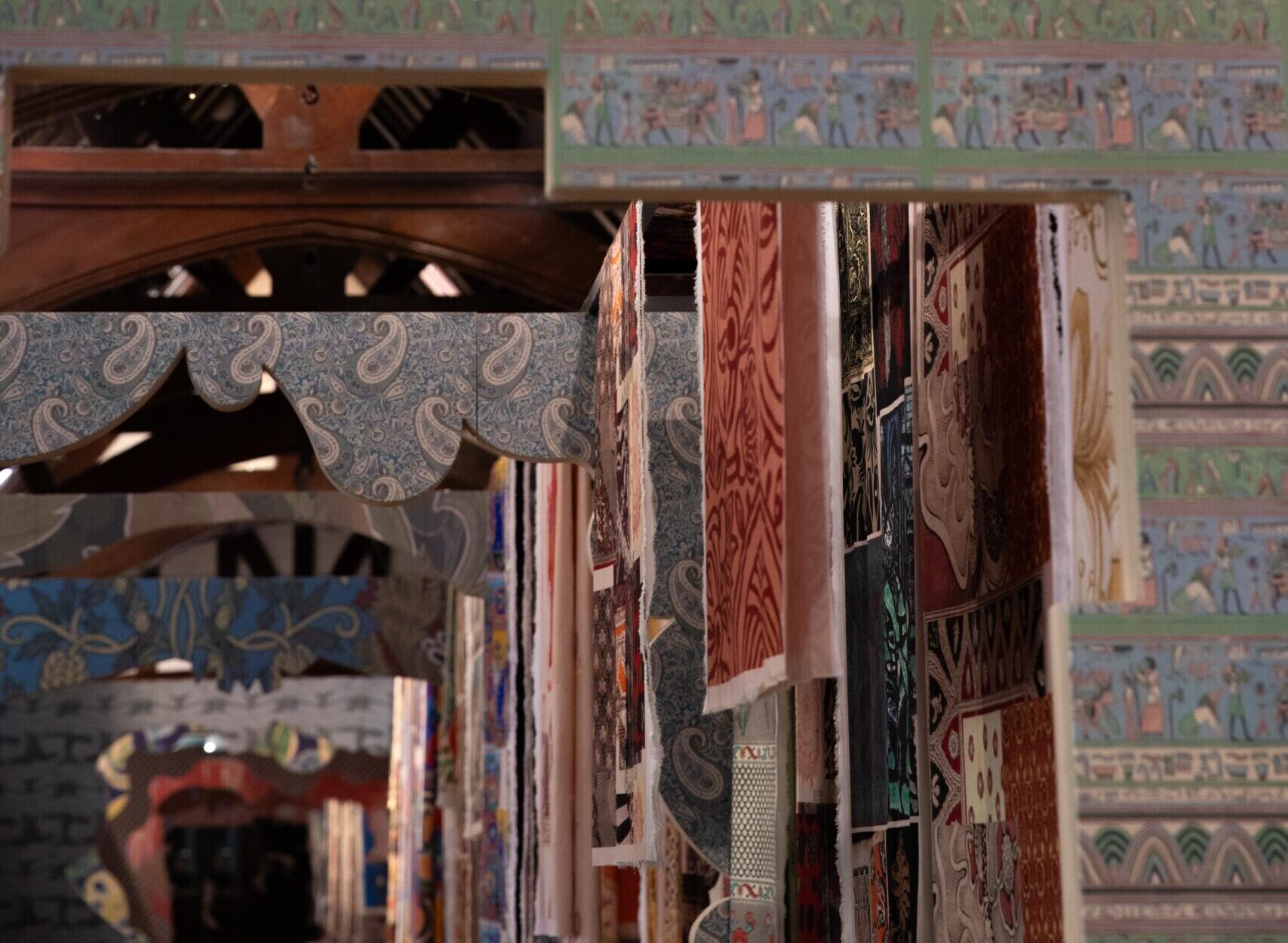 Structured as a journey through Liberty’s past, the exhibition invites visitors to enter a vivid timeline chronicling 150 years of Liberty. Beginning with a nod to the Genesis of the brand’s deep-rooted fascination with global culture and history, references to Egyptian artefacts and Tudor motifs sit alongside those of classical antiquity, amongst others. Throughout the exhibition, Liberty’s print, pattern, and colour development is shown to be in constant dialogue with the world around it.
