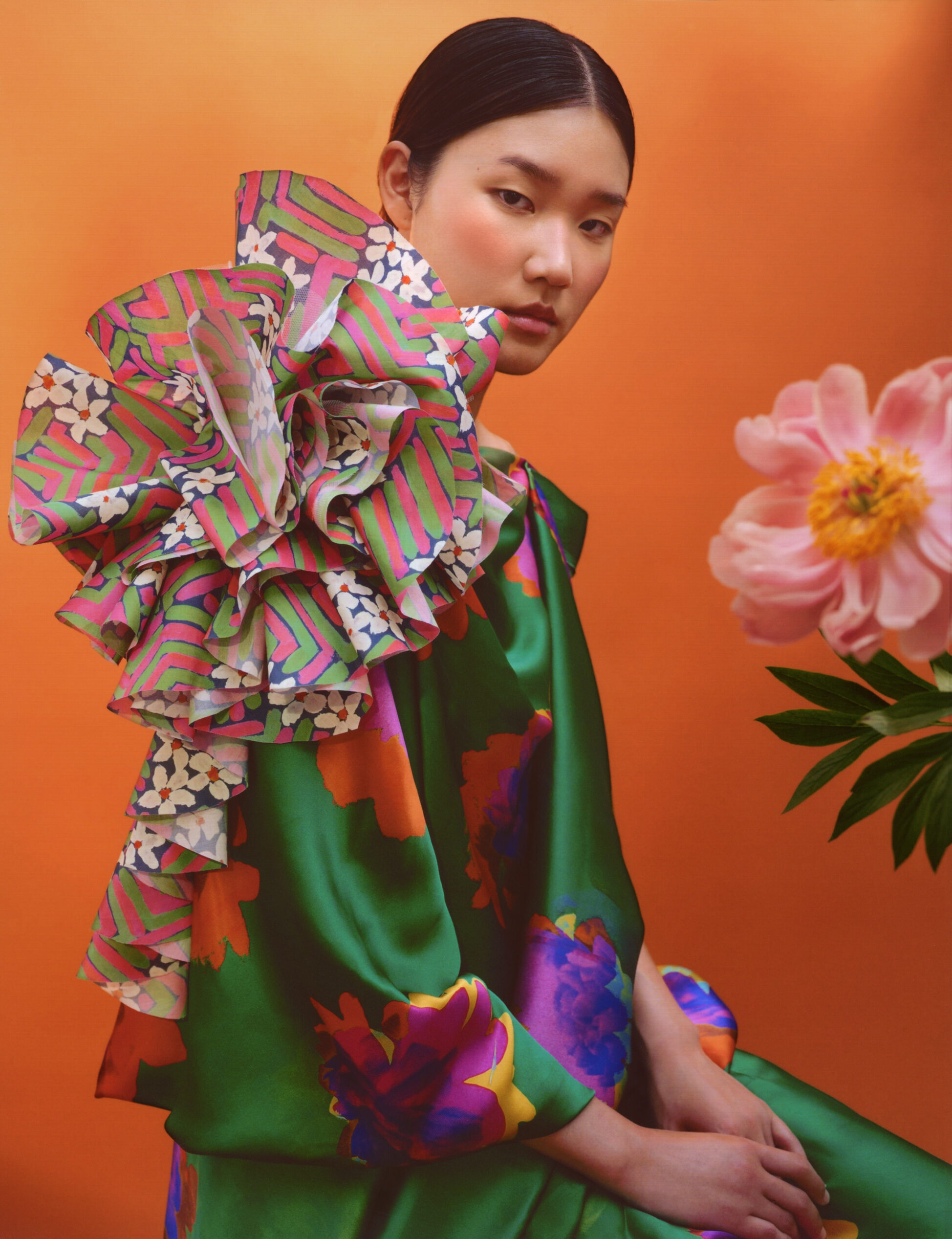 Finally, lose yourself in the collection’s fantastical third story, Floral Wonderland. Brimming with landscapes of unique and otherworldly botanicals, this narrative celebrates a world of never-before-seen species and hybrid varieties. Fictional flowers, created from the Designer’s imagination, create a carnival of nature.
