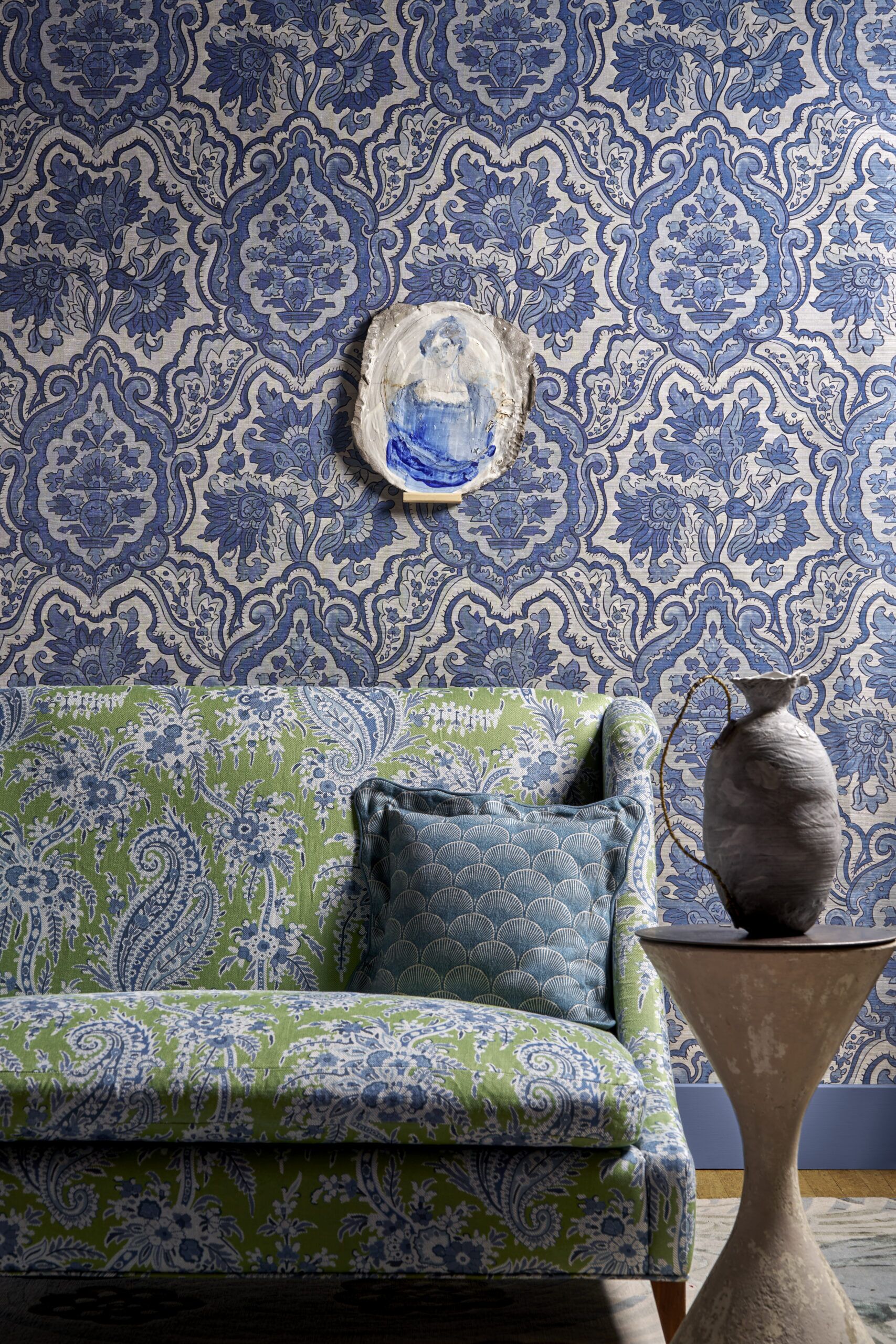 With strong influences from traditional Persian and Islamic design aesthetics, this richly decorated botanical pattern, originally created by Liberty in 1965, seamlessly blends stylised florals with subtle geometric elements. Reminiscent of the exquisite Persian rugs sold at specialist rug department in the Liberty flagship store, Charlton’s intricate shapes follow a symmetrical, tile-like layout. Printed on a lustrous, pearlescent grass-cloth base, each motif is encased within ornate, accentuated frames.