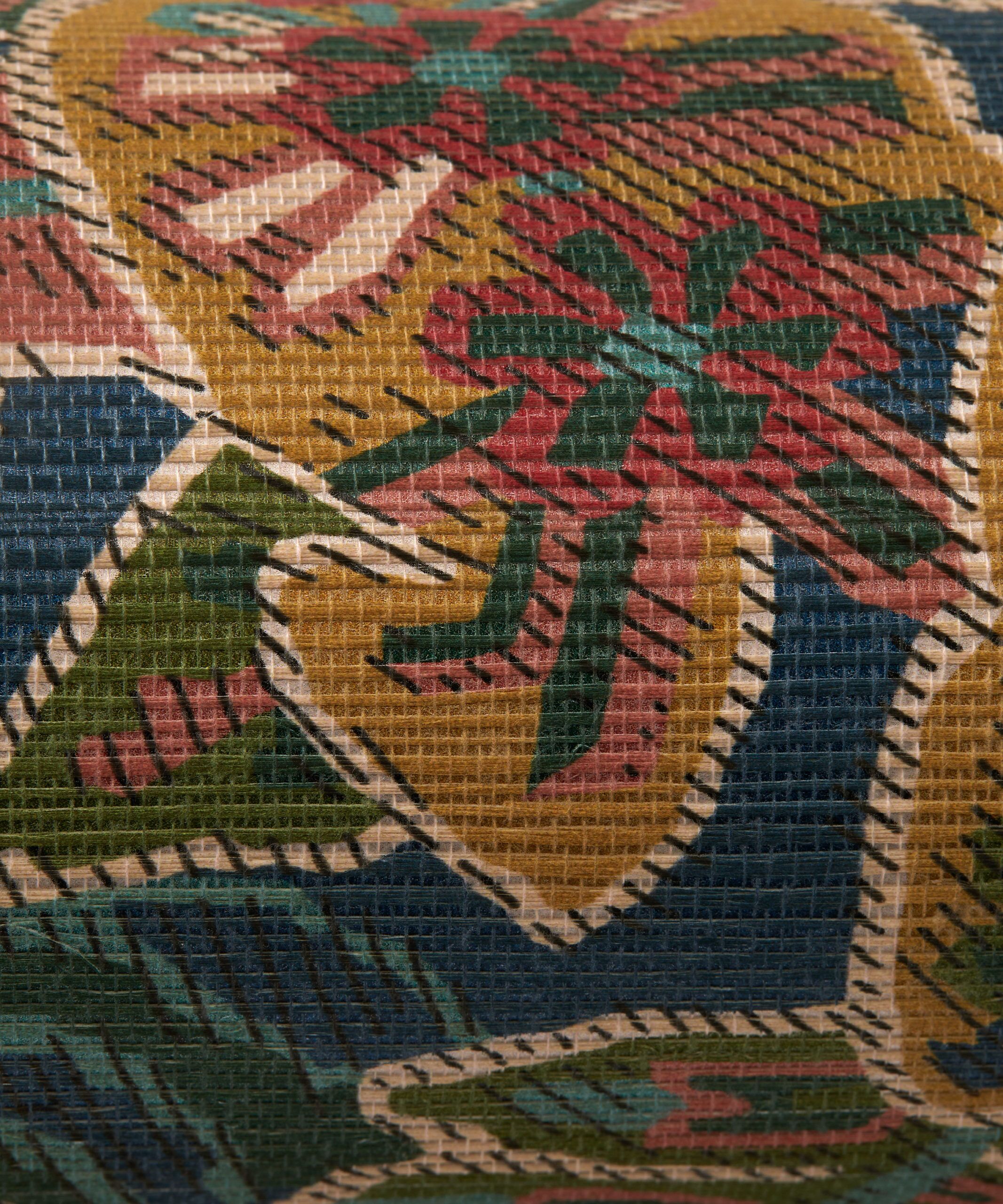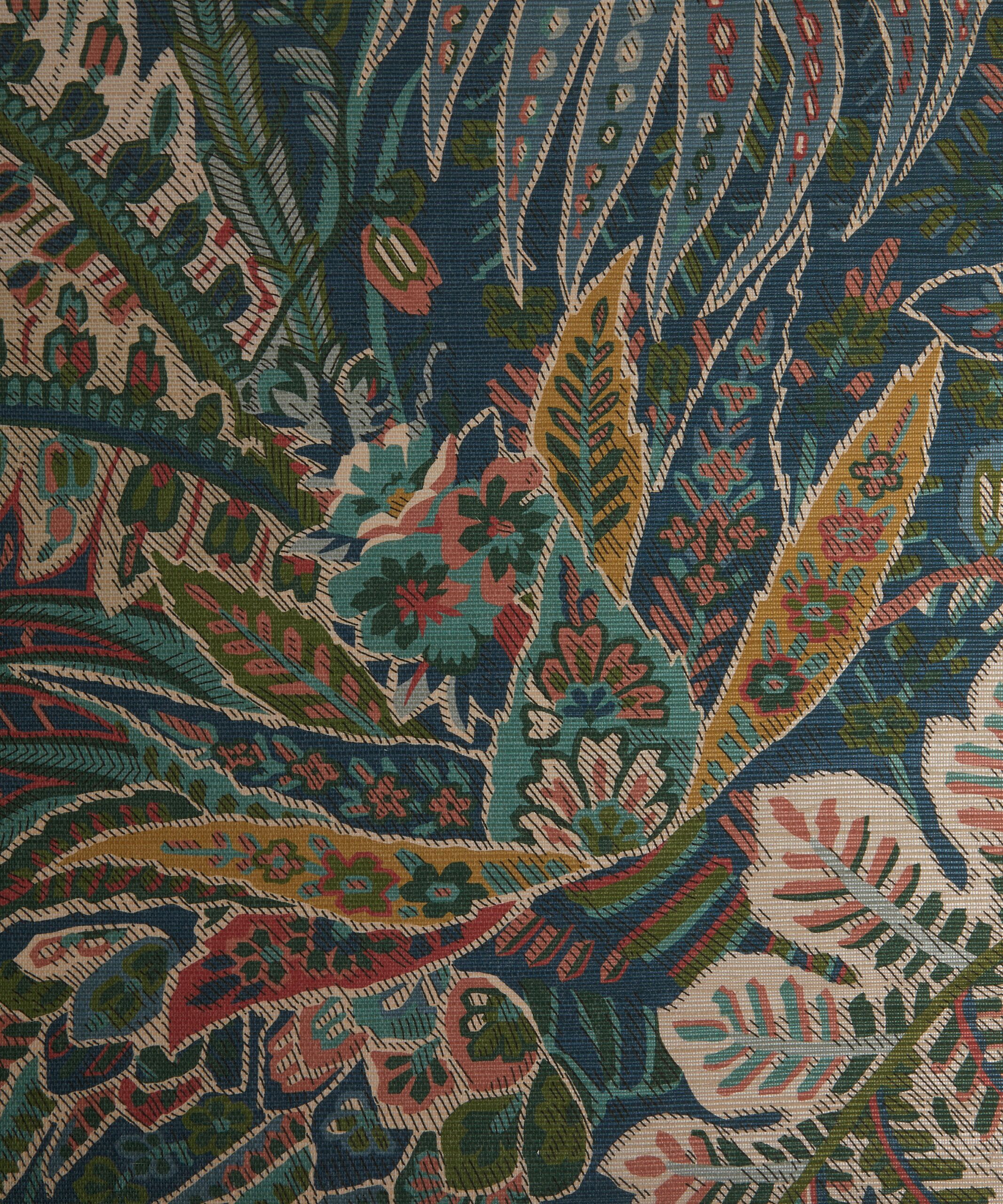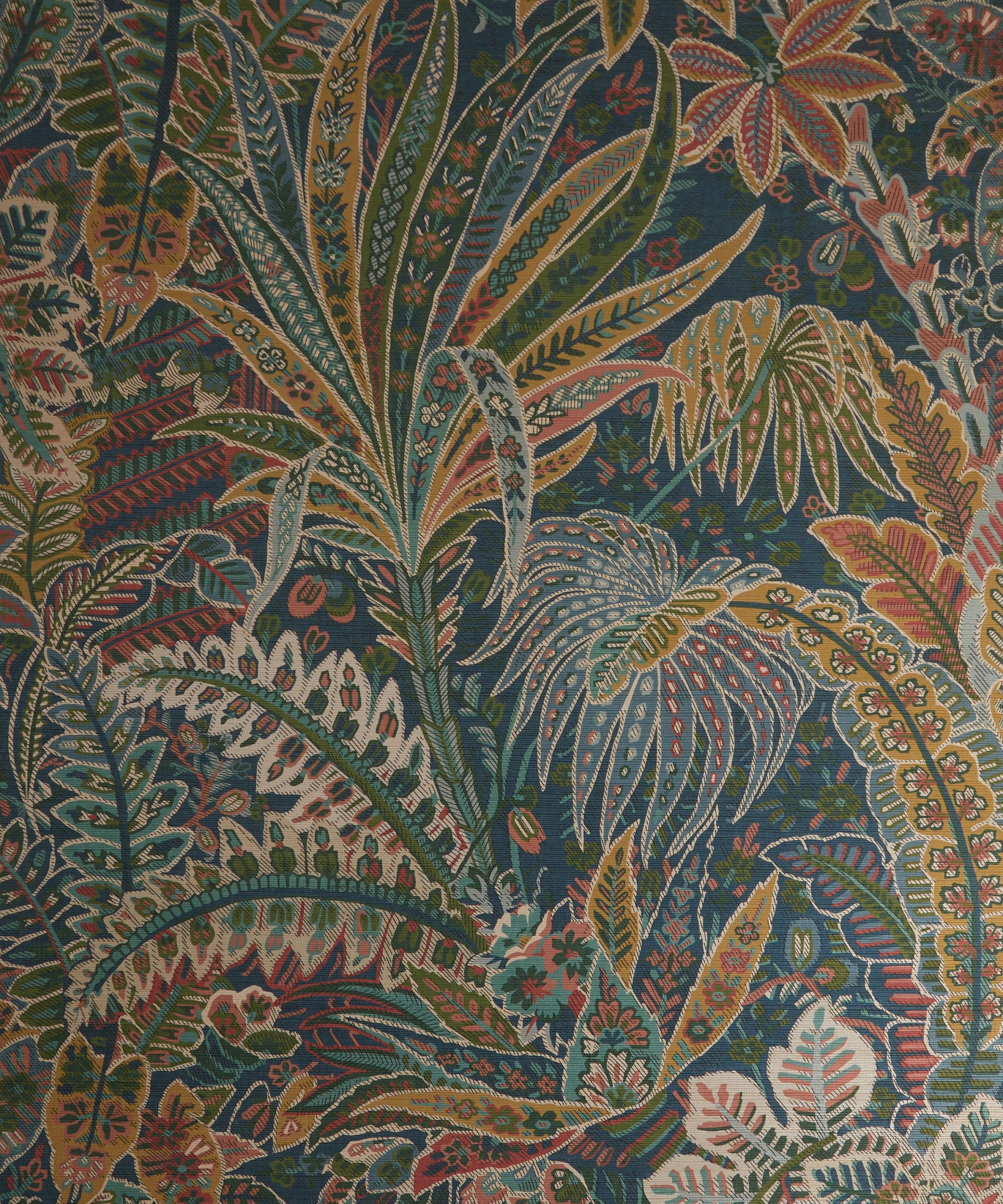 Inspired by a collection of mid-19th century hand painted shawls from the Liberty archive, Cypress Voyage offers a striking rendition of the much-loved Persian Voyage design – with the original design rescaled and reworked into a brand-new layout. A truly spectacular botanical paisley of tropical palms, feathery fronds, and graceful ferns. Printed on a lustrous grass-cloth base which provides luxurious tactility and richness of colour.