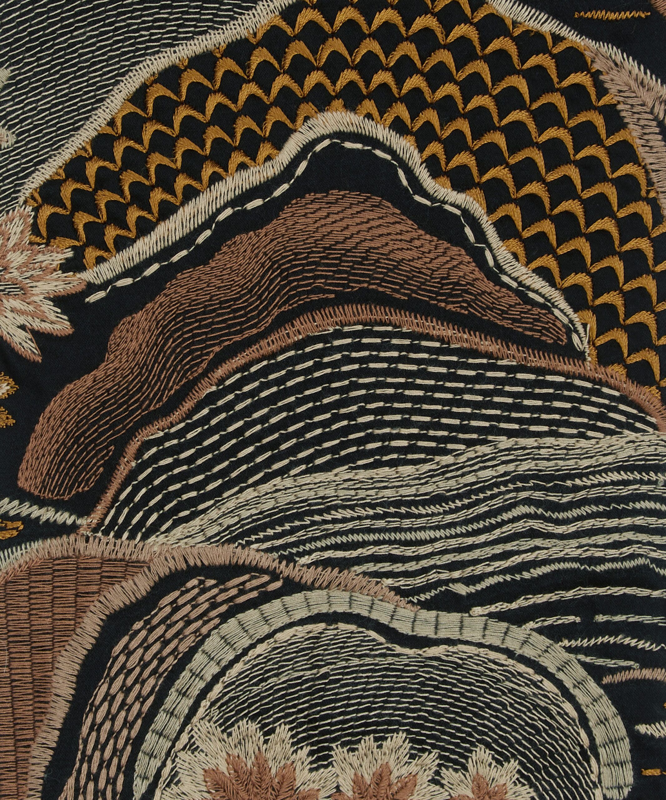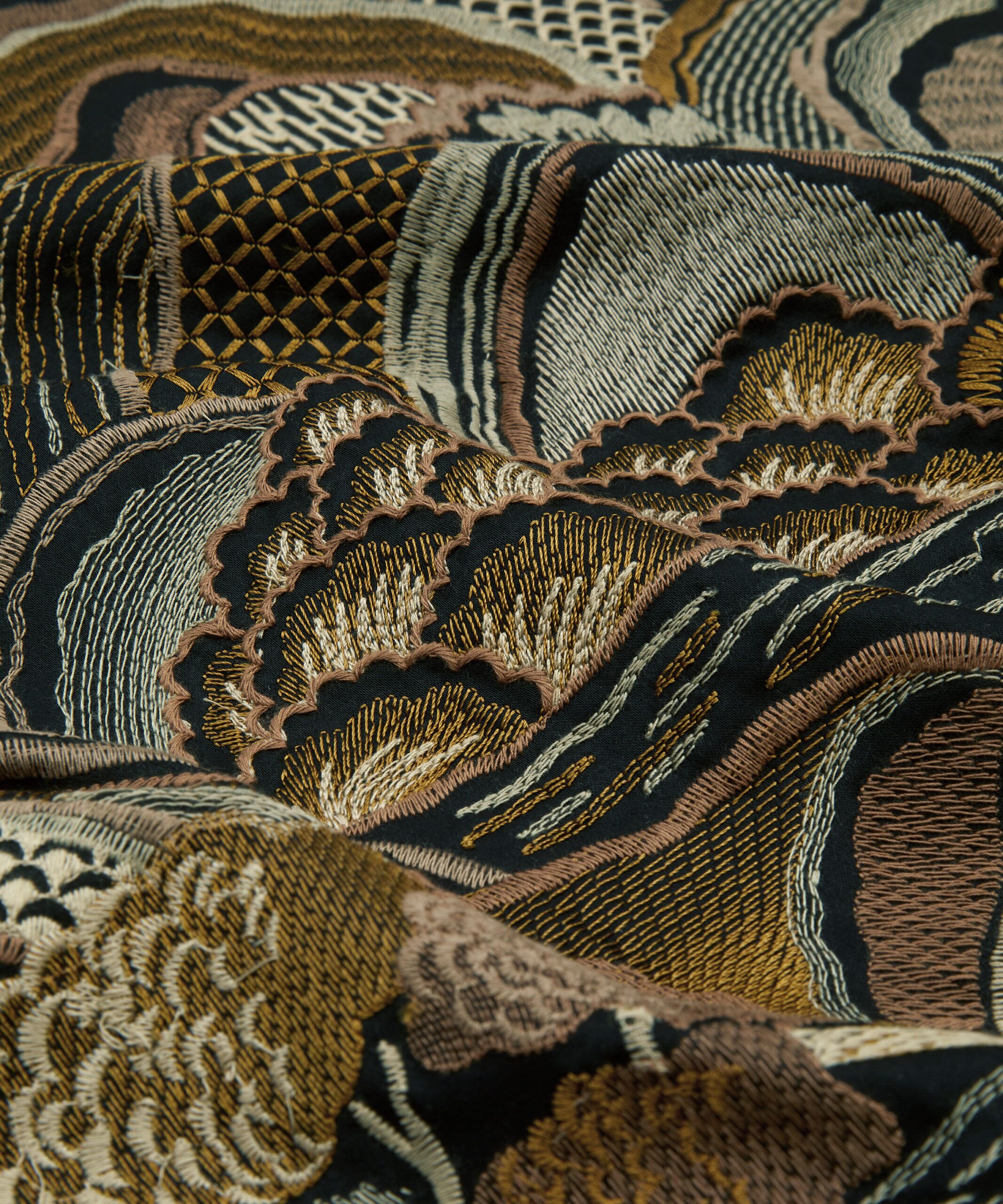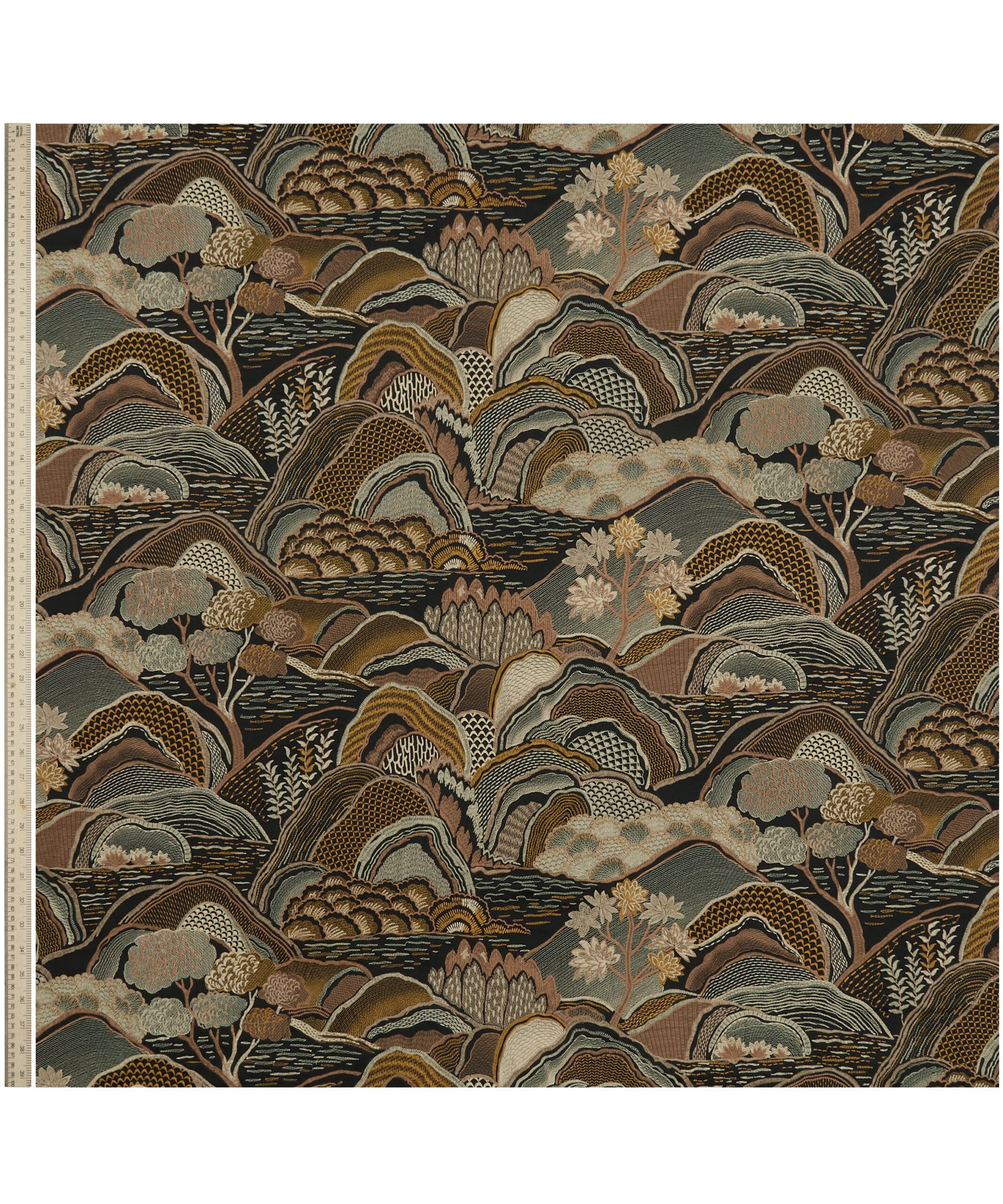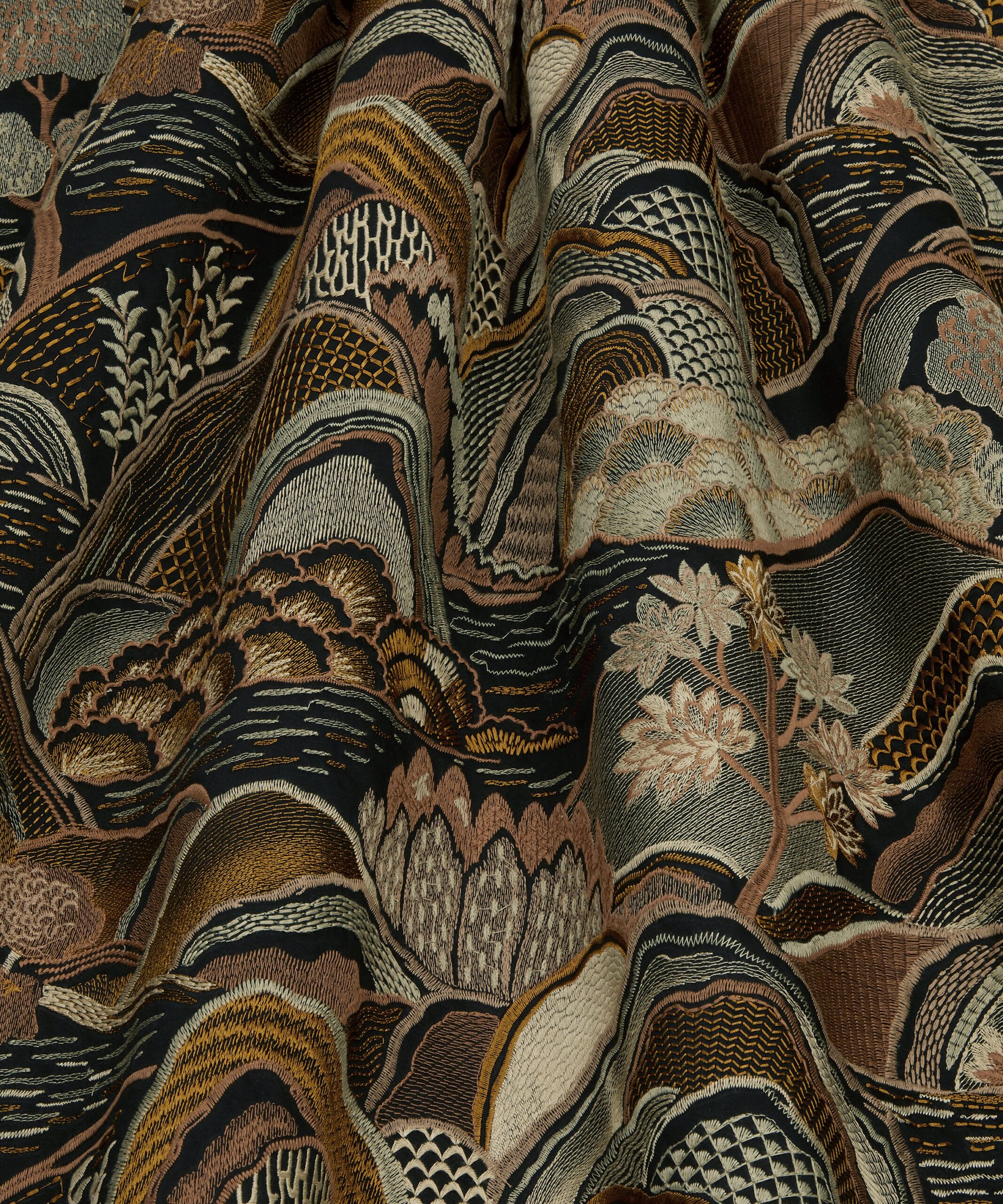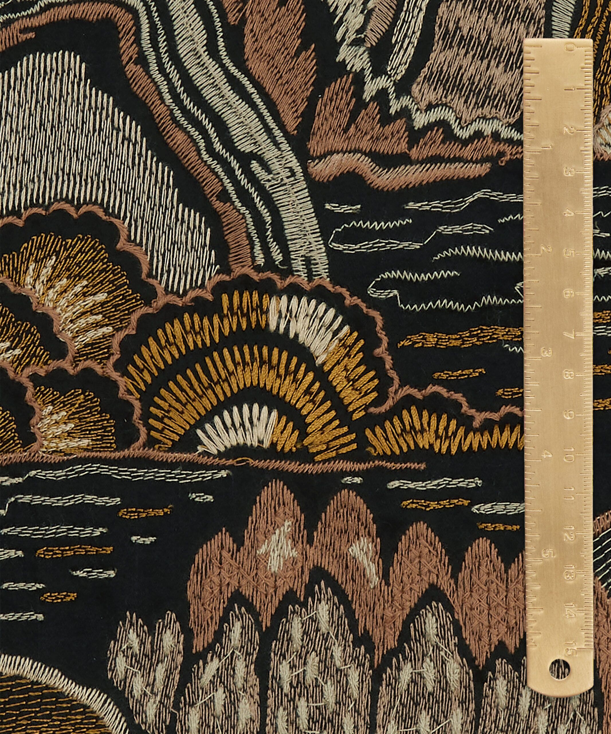 Inspired by Japanese mountainscapes and ancient forests, this dramatic scenic embroidery perfectly complements the printed arboreal and floral artworks in the collection. Densely embroidered in two colourways, with matte and soft sheen yarns, this design is suitable for drapery, cushions, and accessories.
