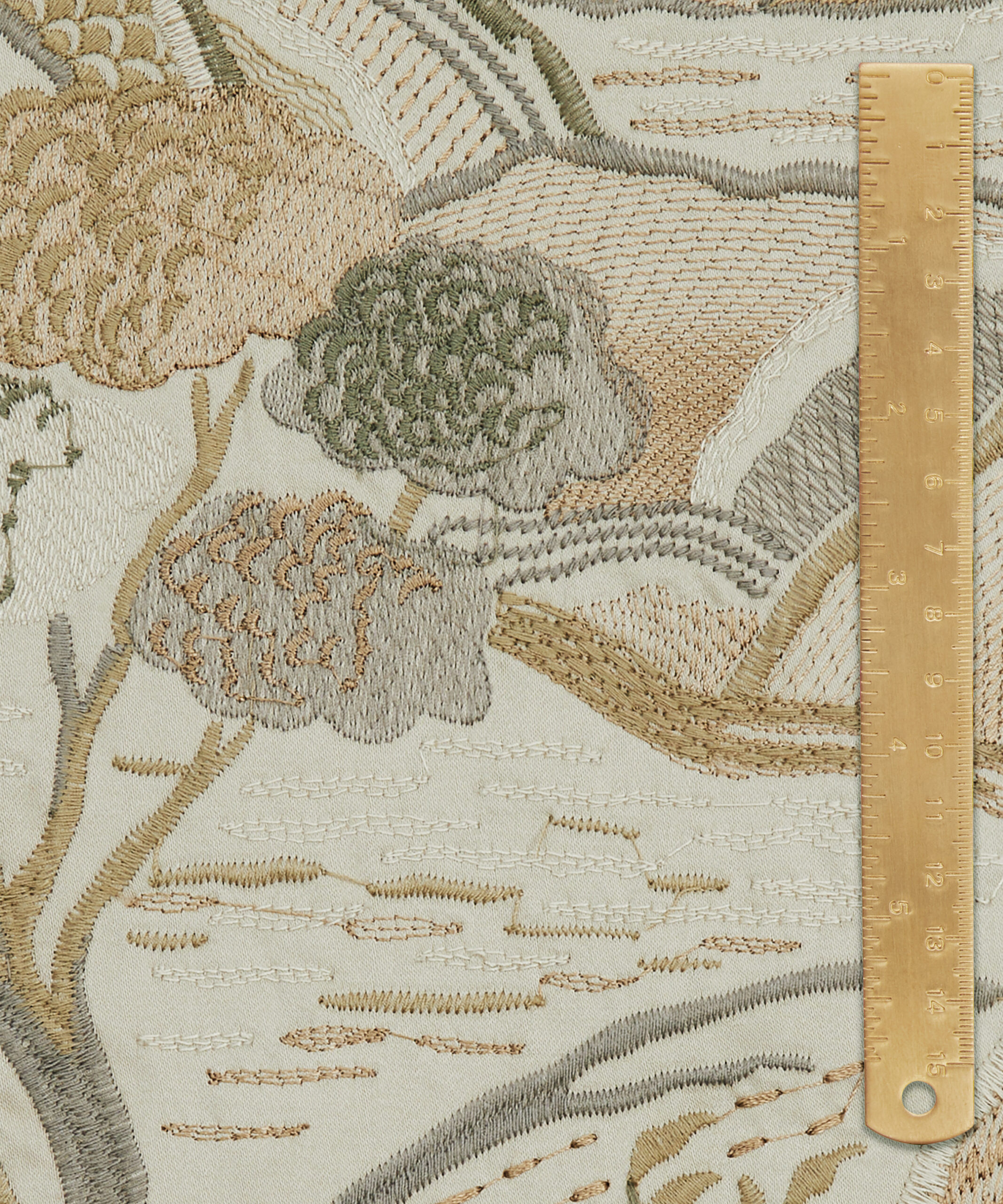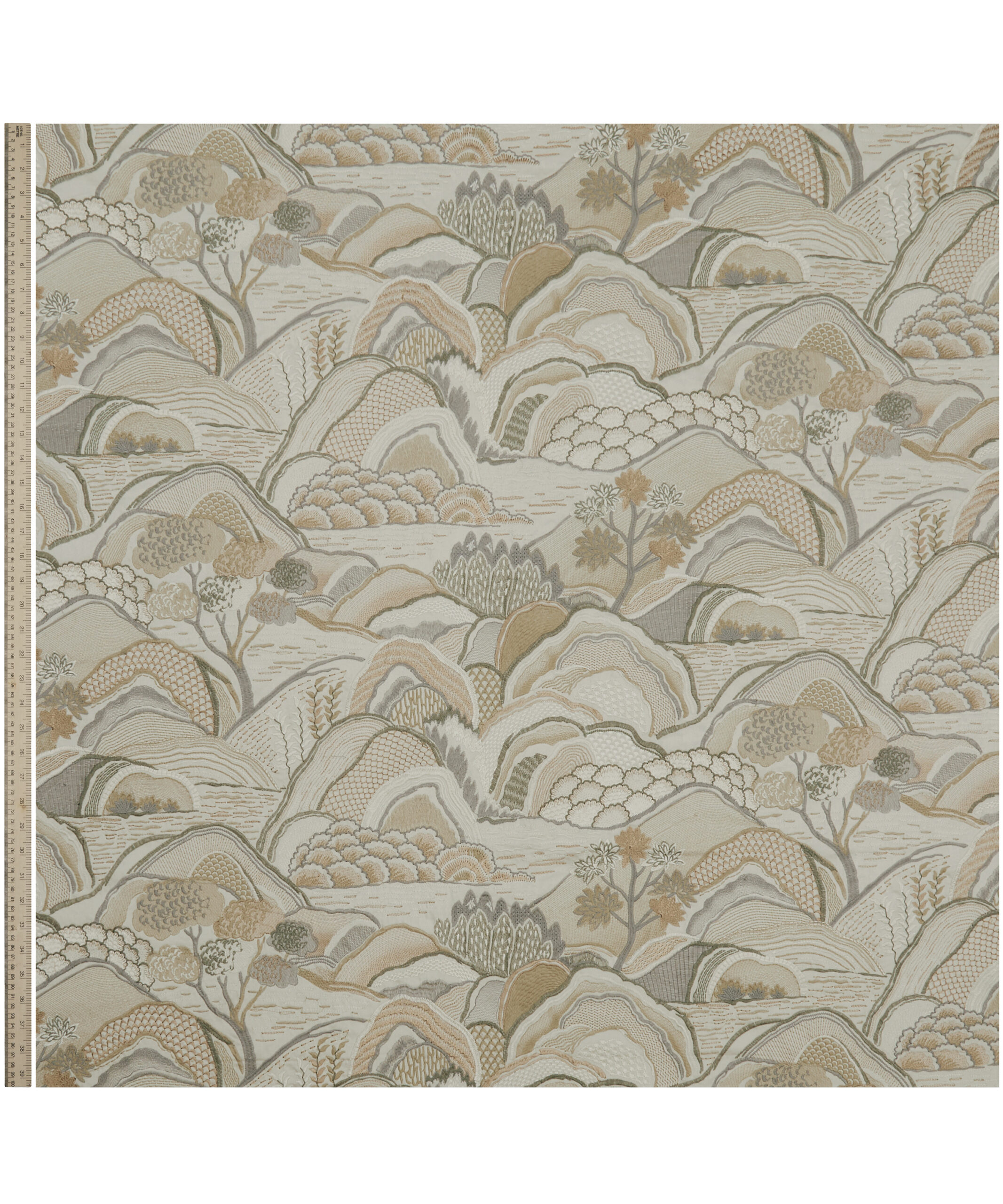 Inspired by Japanese mountainscapes and ancient forests, this dramatic scenic embroidery perfectly complements the printed arboreal and floral artworks in the collection. Densely embroidered in two colourways, with matte and soft sheen yarns, this design is suitable for drapery, cushions, and accessories.