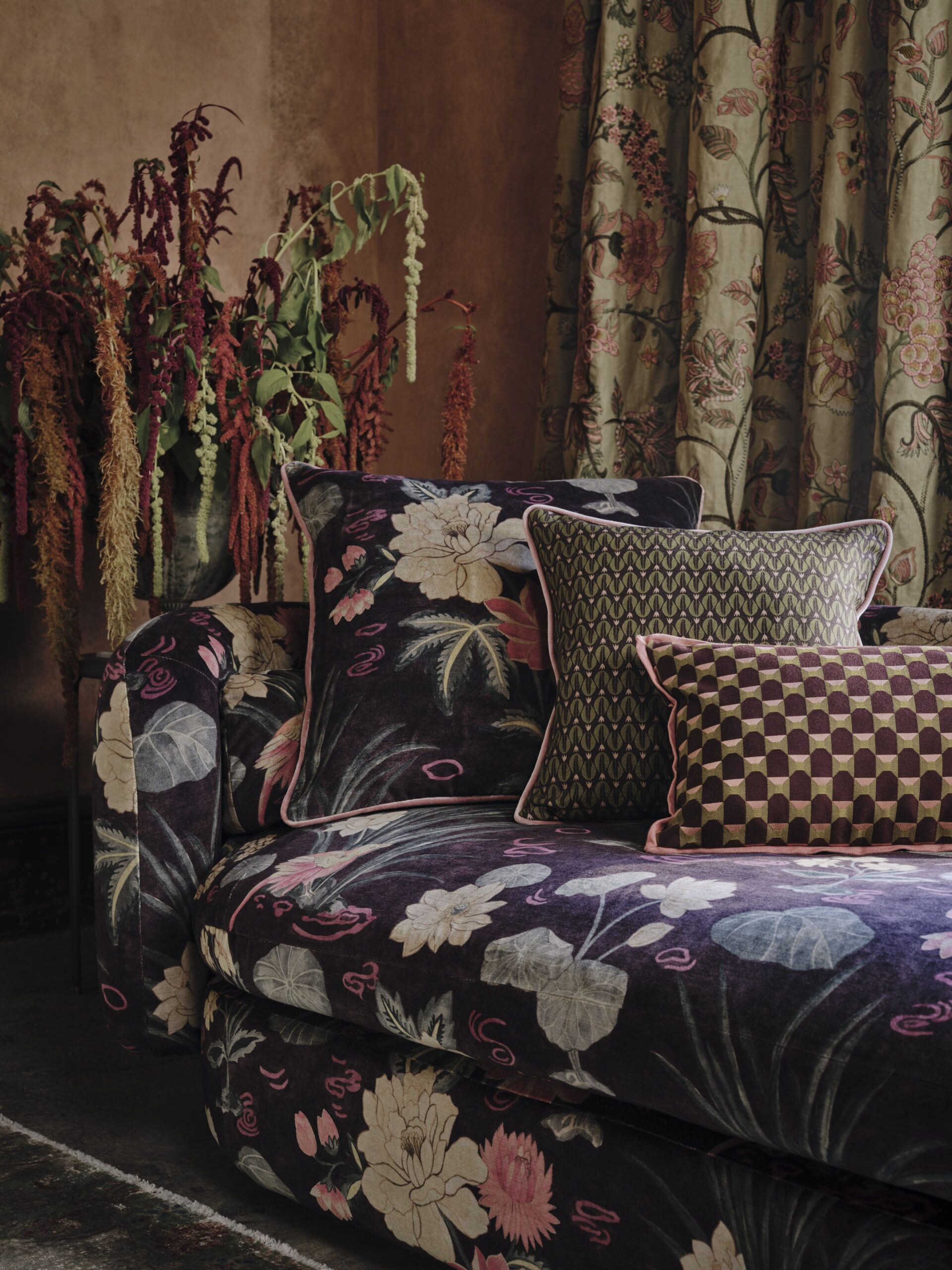 Influenced by opera coats from the Liberty archive and antique Japanese kimono linings, the Botanical Atlas Weaves collection consists of six designs across five unique colour stories: Lacquer, Jade, Lapis, Pewter, and Lichen. From richly textured graphic weaves to soft plush sheens, this vibrant fabric collection is suitable for upholstery, drapery, cushions, and accessories.