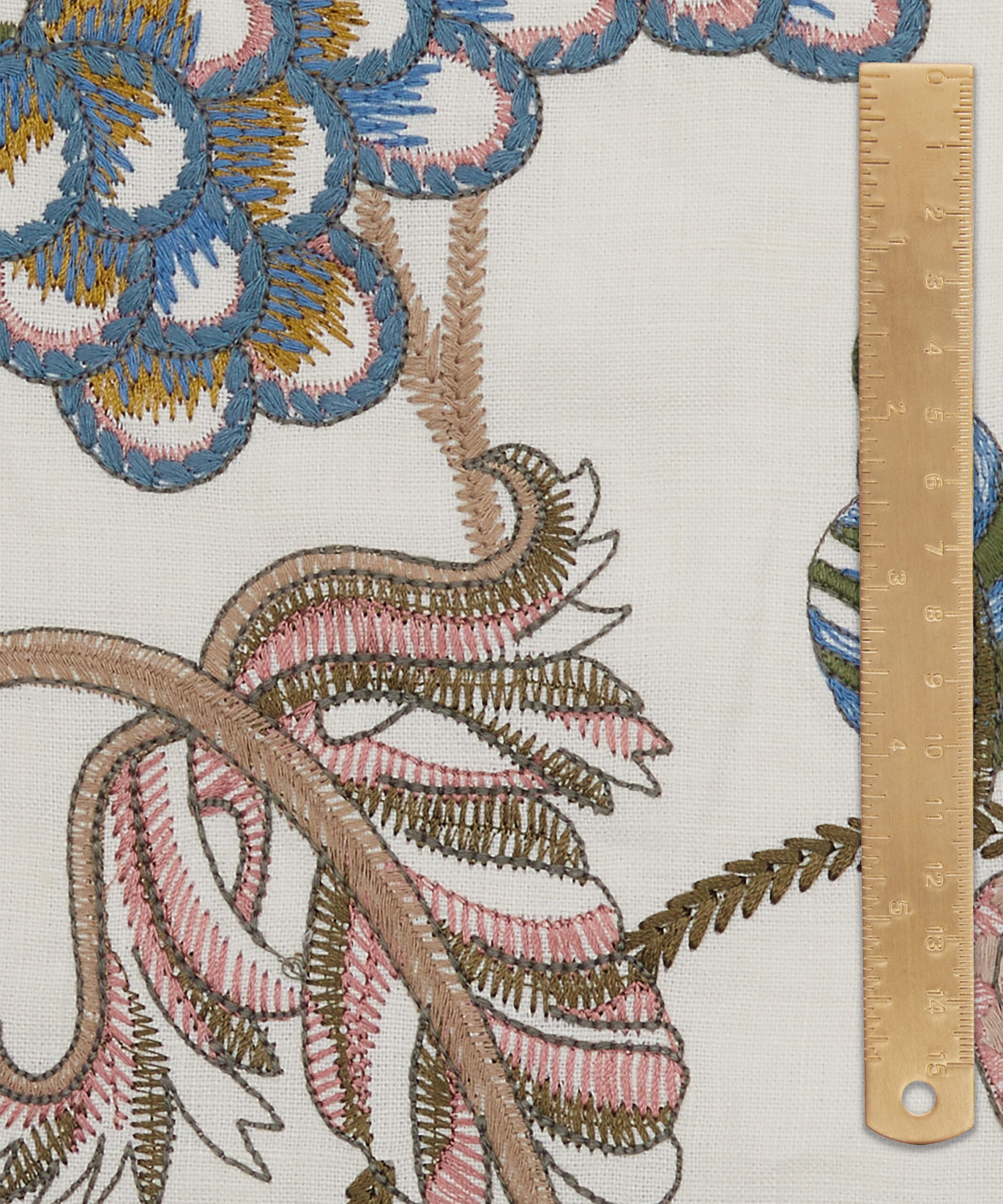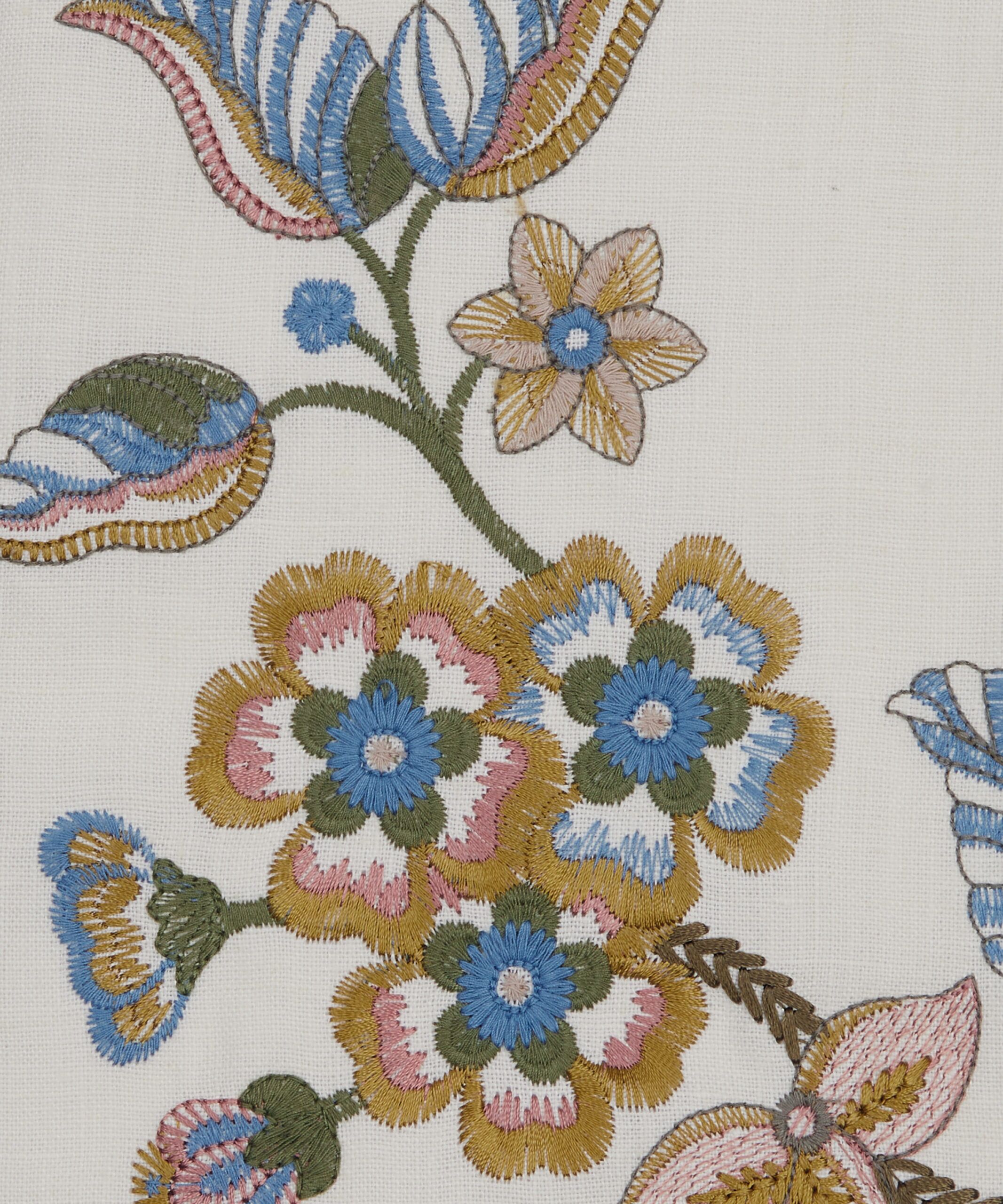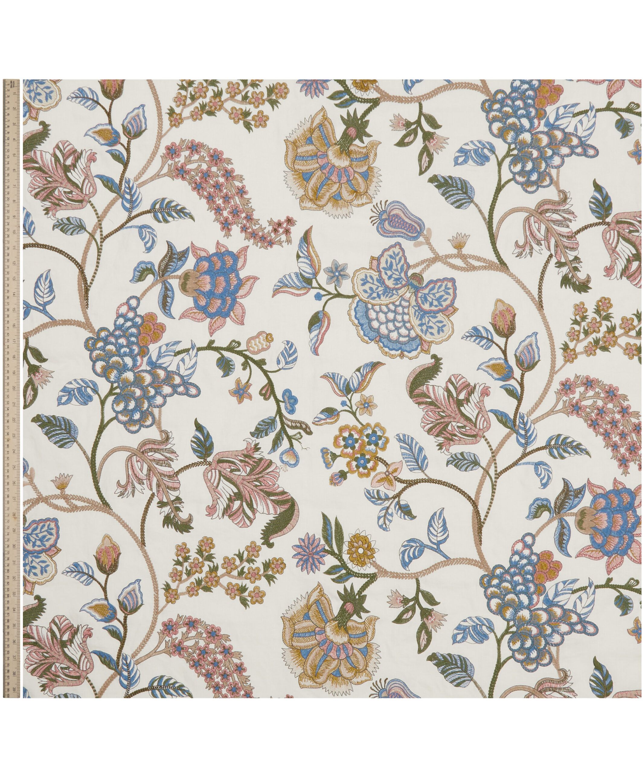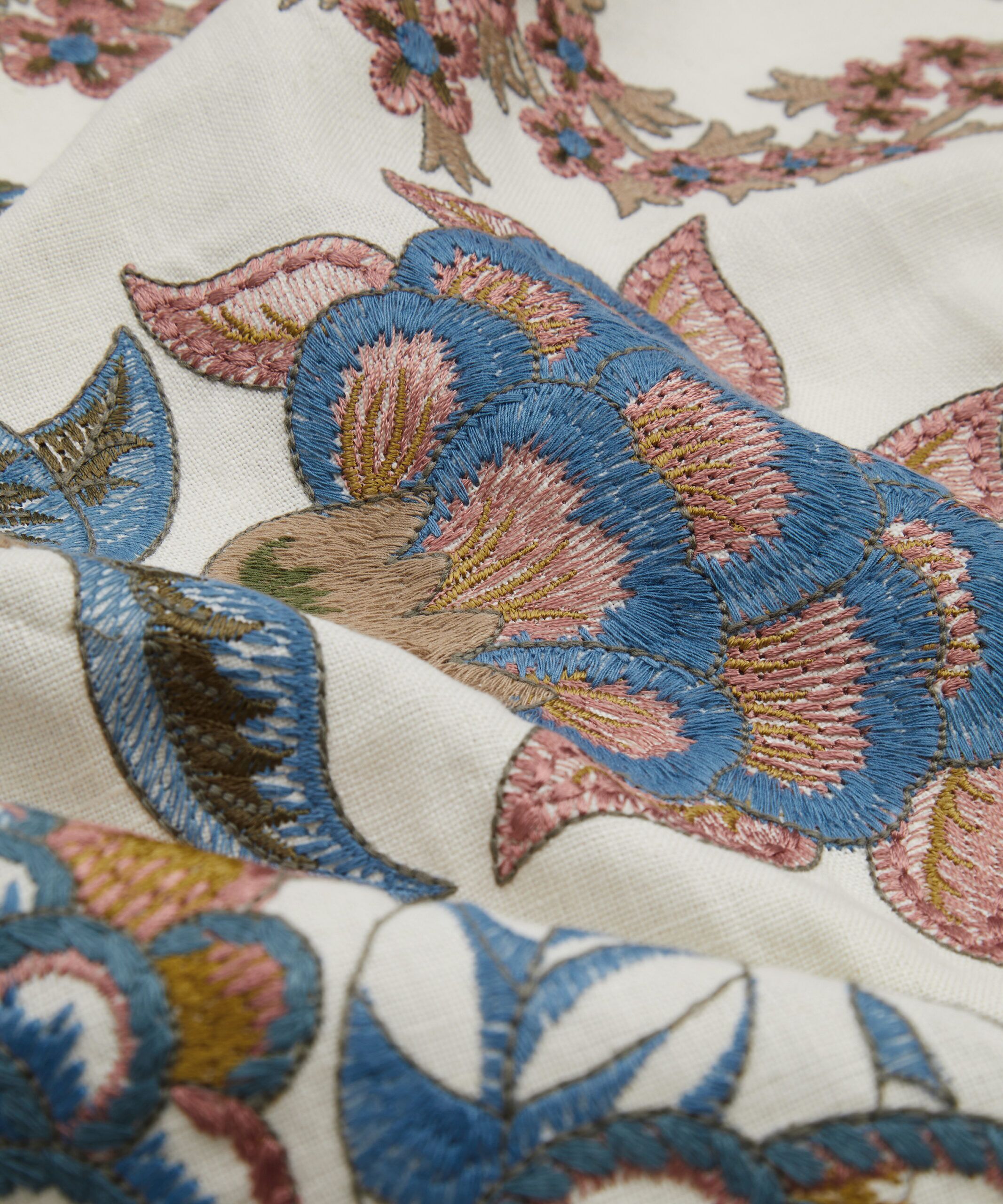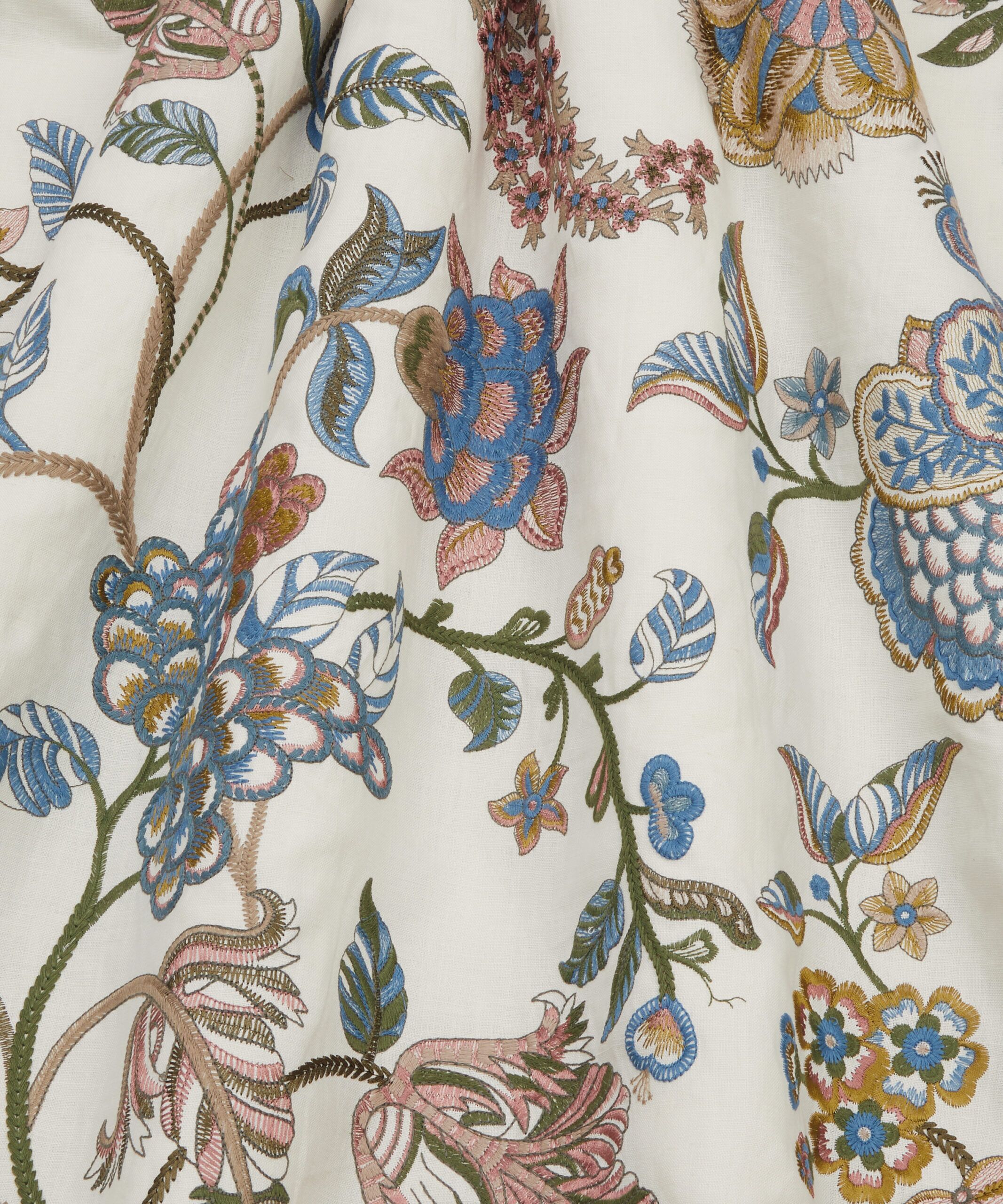 Taken from an antique Tree of Life design within the Liberty archive, Palampore Embroidery has historically appeared as a best-selling scarf design. For this collection, the Liberty Design Studio have lovingly reworked the original artwork into a simpler composition to enhance the striking floral motifs. Embroidered in India by master craftsmen, the design has been imagined into three colourways. With subtle mineral-like lustre and tonal richness, these colour stories are reminiscent of the exquisite plant and insect dyes that originally inspired the design. Suitable for drapery, cushions, and accessories.