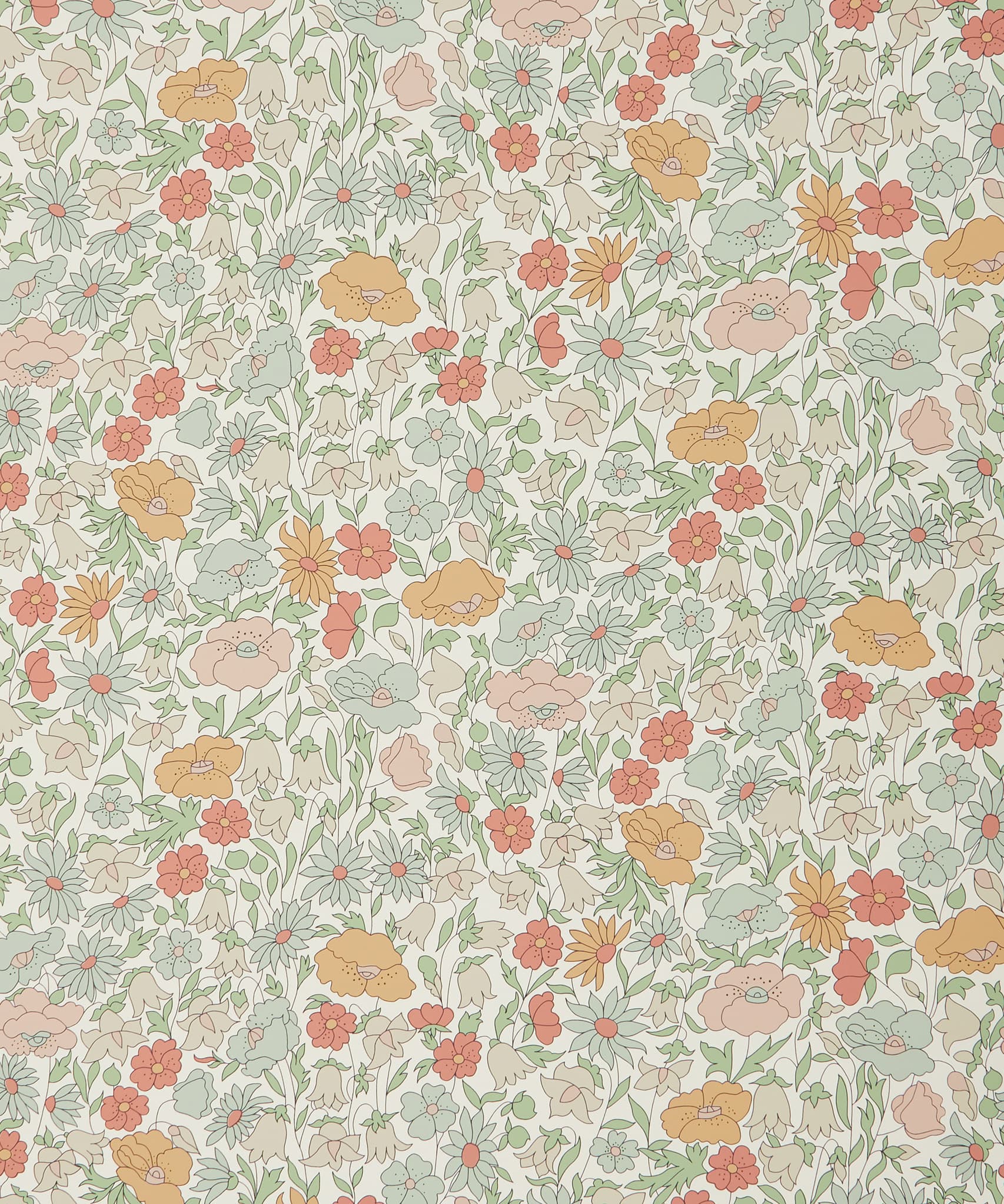 Poppy Meadowfield is a reworking of a much-loved archival print from 1910. Redrawn and rebalanced as a contemporary wallpaper design, the fine outlines and plains of solid colour mark this as an instantly recognisable Liberty floral. Design details are captured using a rotary printing technique, softly emulating the screen-printed look of the original. Different opacities of ink are layered to create richly coloured and textured effects in matte and lustred hues.