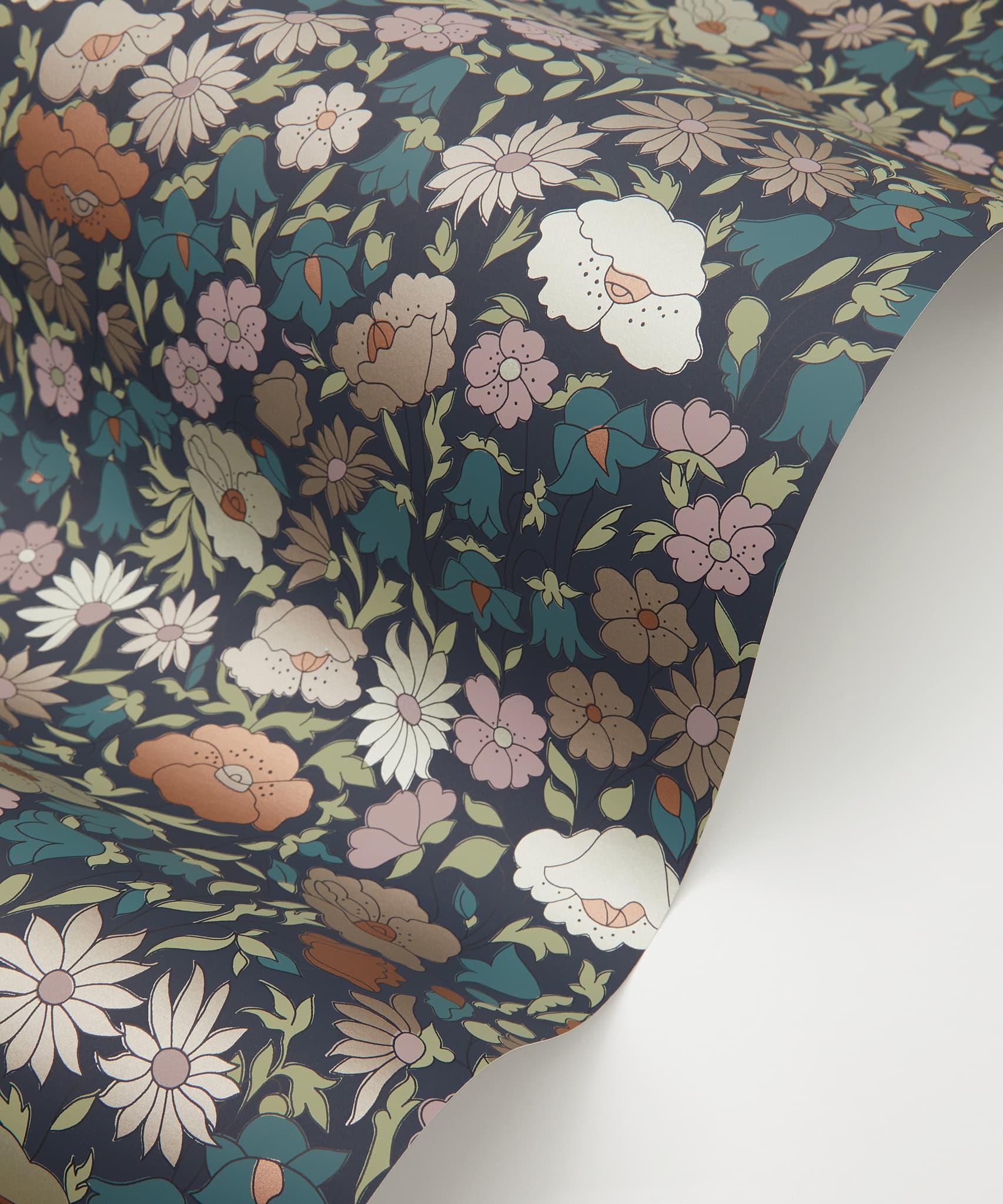 Poppy Meadowfield is a reworking of a much-loved archival print from 1910. Redrawn and rebalanced as a contemporary wallpaper design, the fine outlines and plains of solid colour mark this as an instantly recognisable Liberty floral. Design details are captured using a rotary printing technique, softly emulating the screen-printed look of the original. Different opacities of ink are layered to create richly coloured and textured effects in matte and lustred hues.