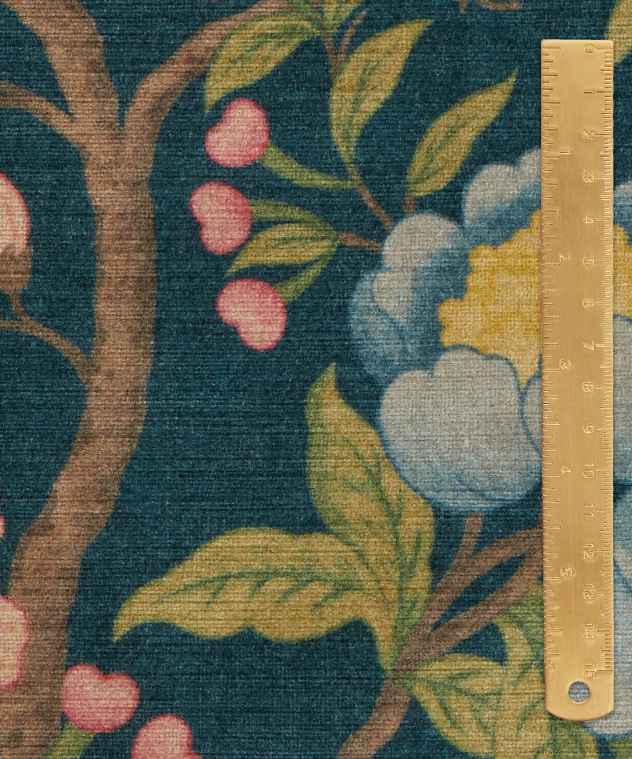Porcelain Trail is inspired by a hand-painted furnishing design, originally printed for Liberty during the late 1960s. Exquisitely redrawn, resized, and recoloured, this ornate floral pattern is bathed in a beautiful soft light which accentuates the nuanced tones and textures of the design. Its winding branches are dotted with blossom flowers and spectacular chrysanthemums, combining directional design, artistry, and innovation. Printed on a rich sumptuous velvet, suitable for upholstery, drapery, cushions, and accessories.