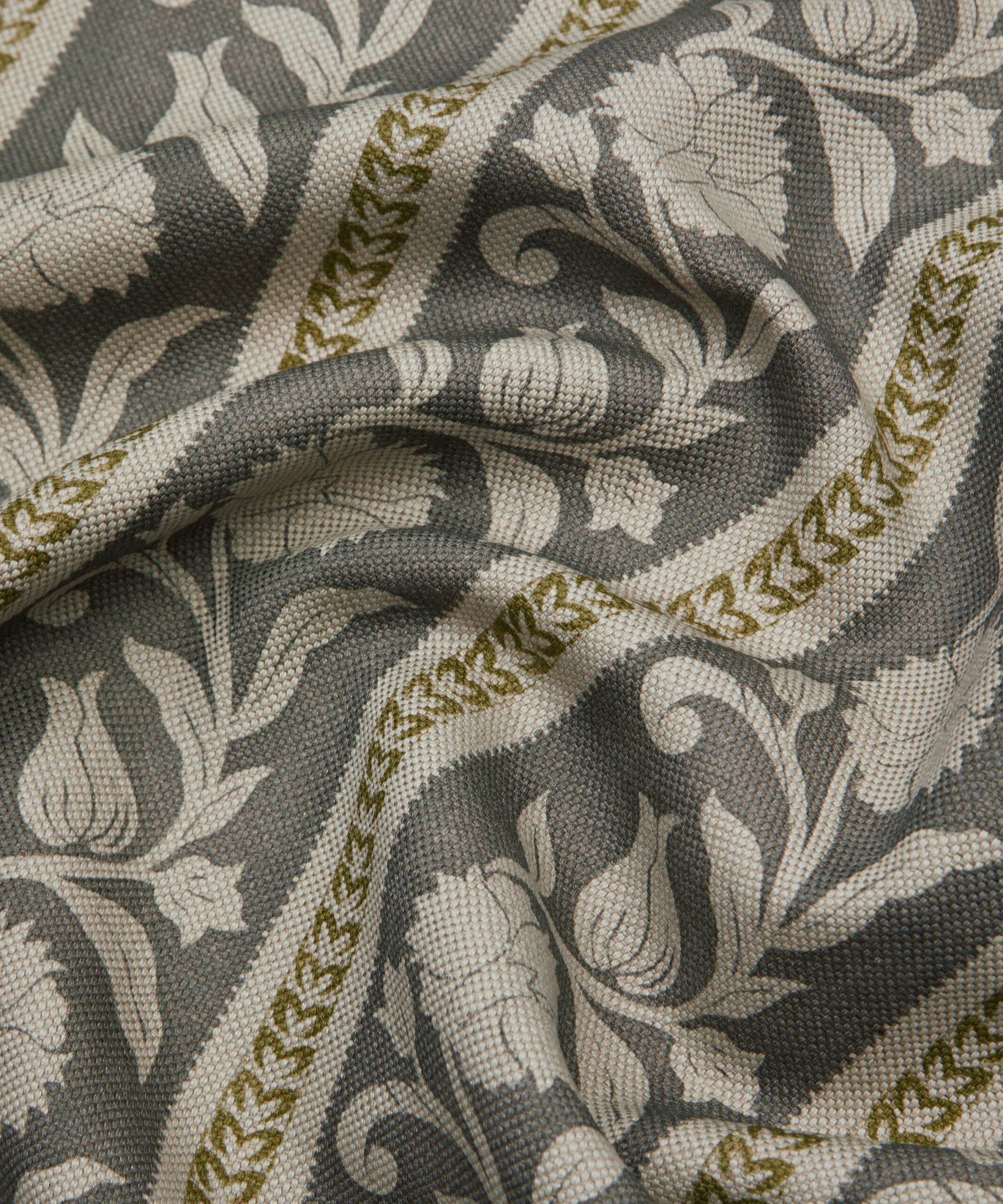 Inspired by decorative shawls from the 1900s, Sambourne Stripe incorporates intricate floral motifs from Sambourne Vine in an elegant floral stripe. Offered in four colourways, this design offers a versatile coordinate fabric. Printed in Italy on a compact linen cotton-mix fabric, this pattern is suitable for upholstery, drapery, cushions, and accessories.