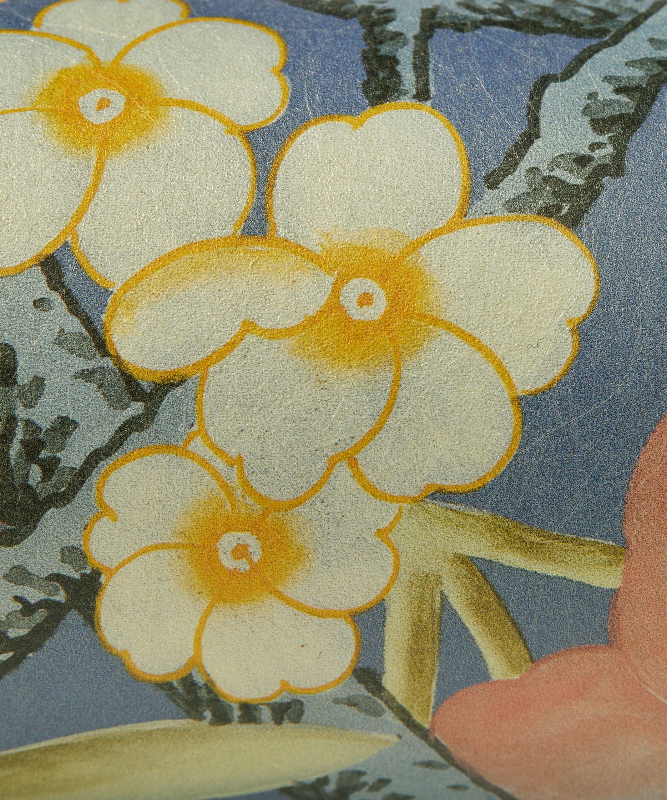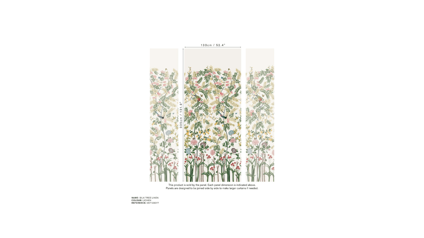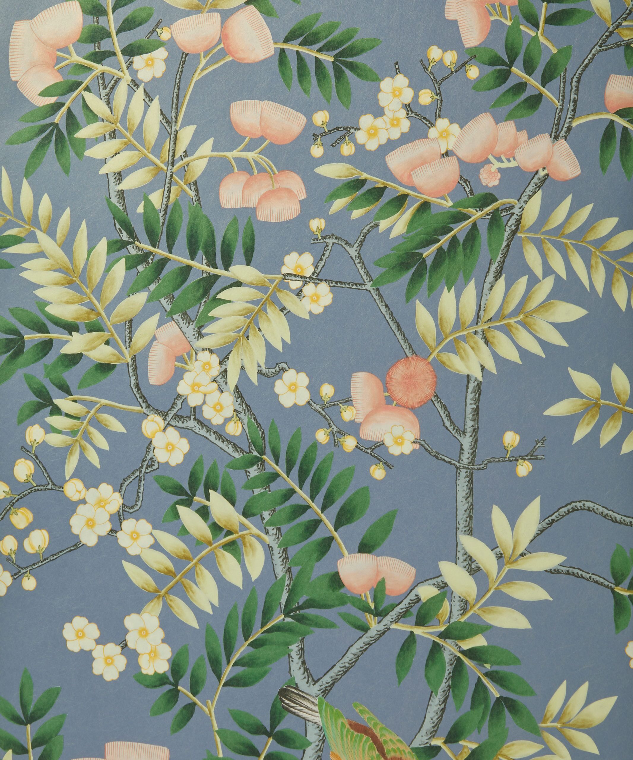 This striking pattern is a refreshingly modern Chinoiserie design. Commissioned artwork created by artists and experts in traditional Chinese silk painting techniques, using metallic silk paper, was reworked into a scenic panel by the Liberty Design Studio. Silk Tree features a joyous canopy of tree and Bamboo branches, decorated with birds, butterflies, Persian Silk Tree flowers, Chinese Physalis, Amaryllis, and Peonies.