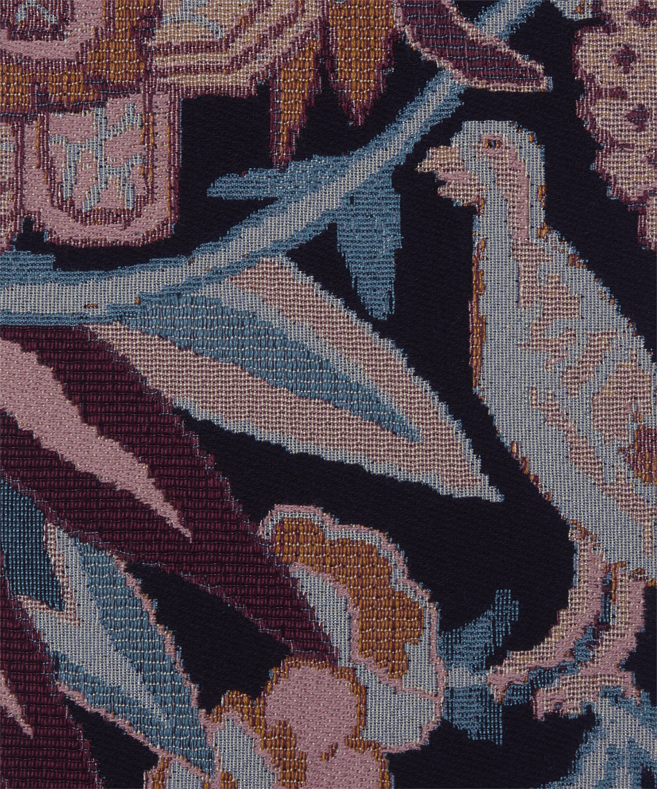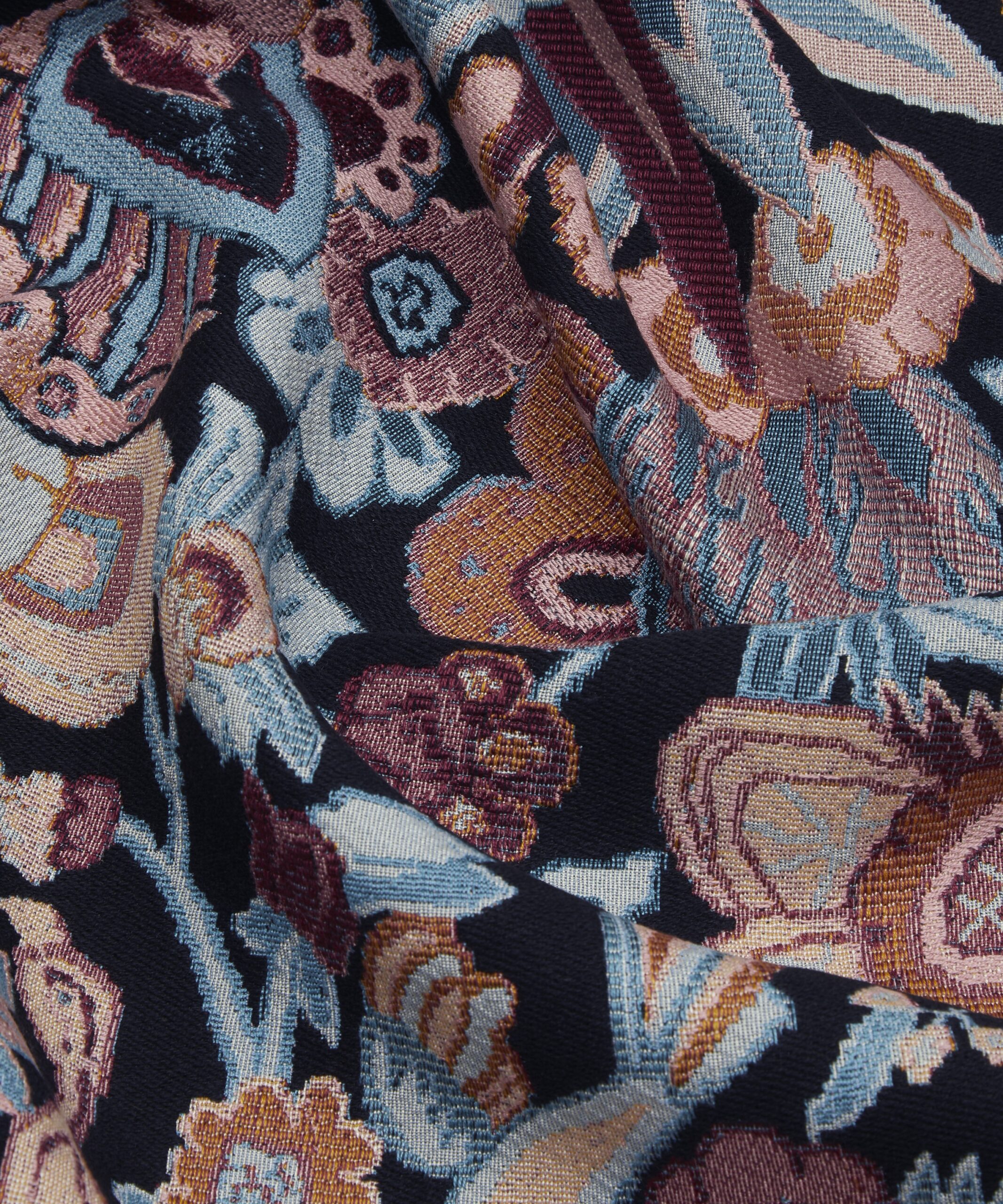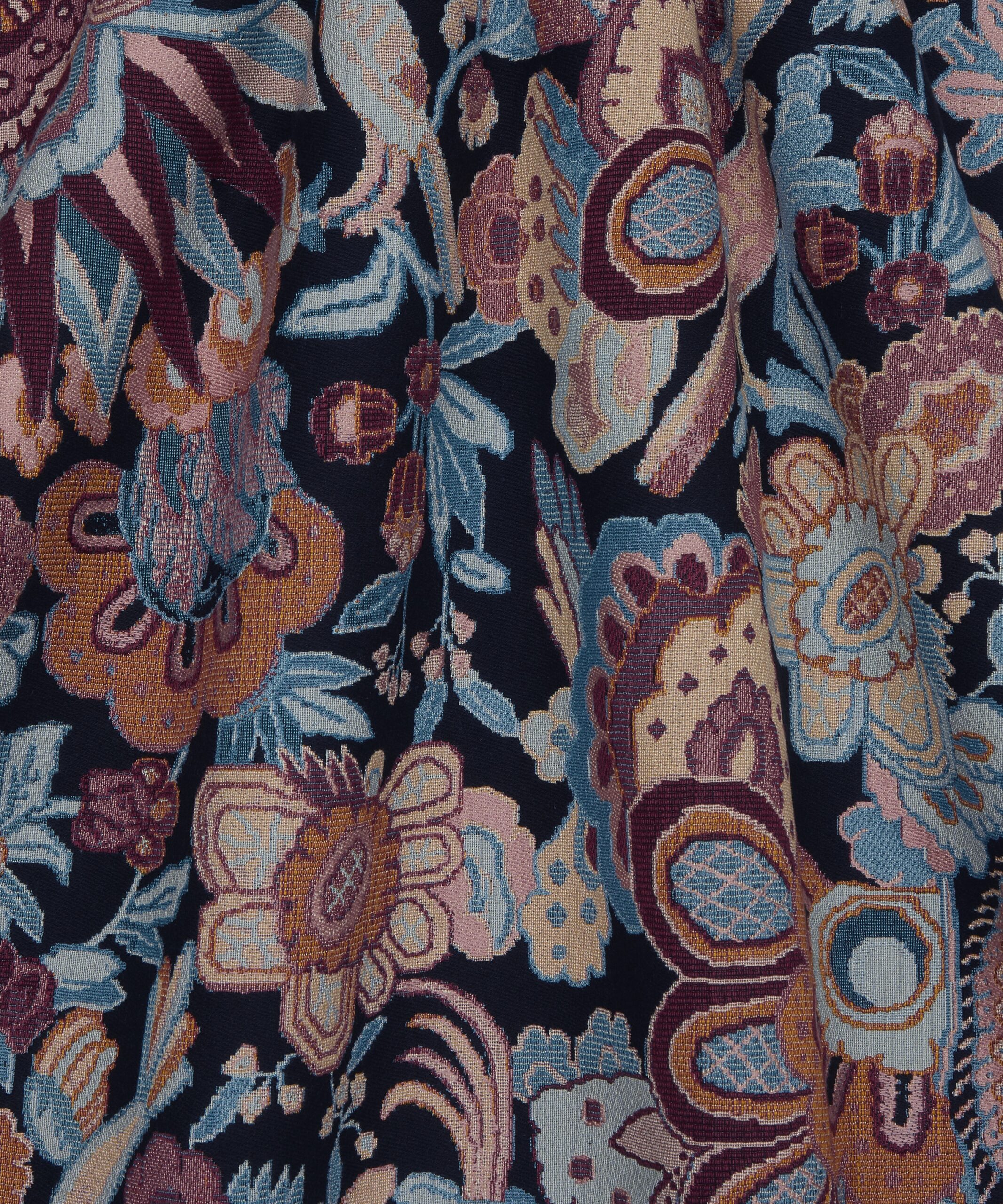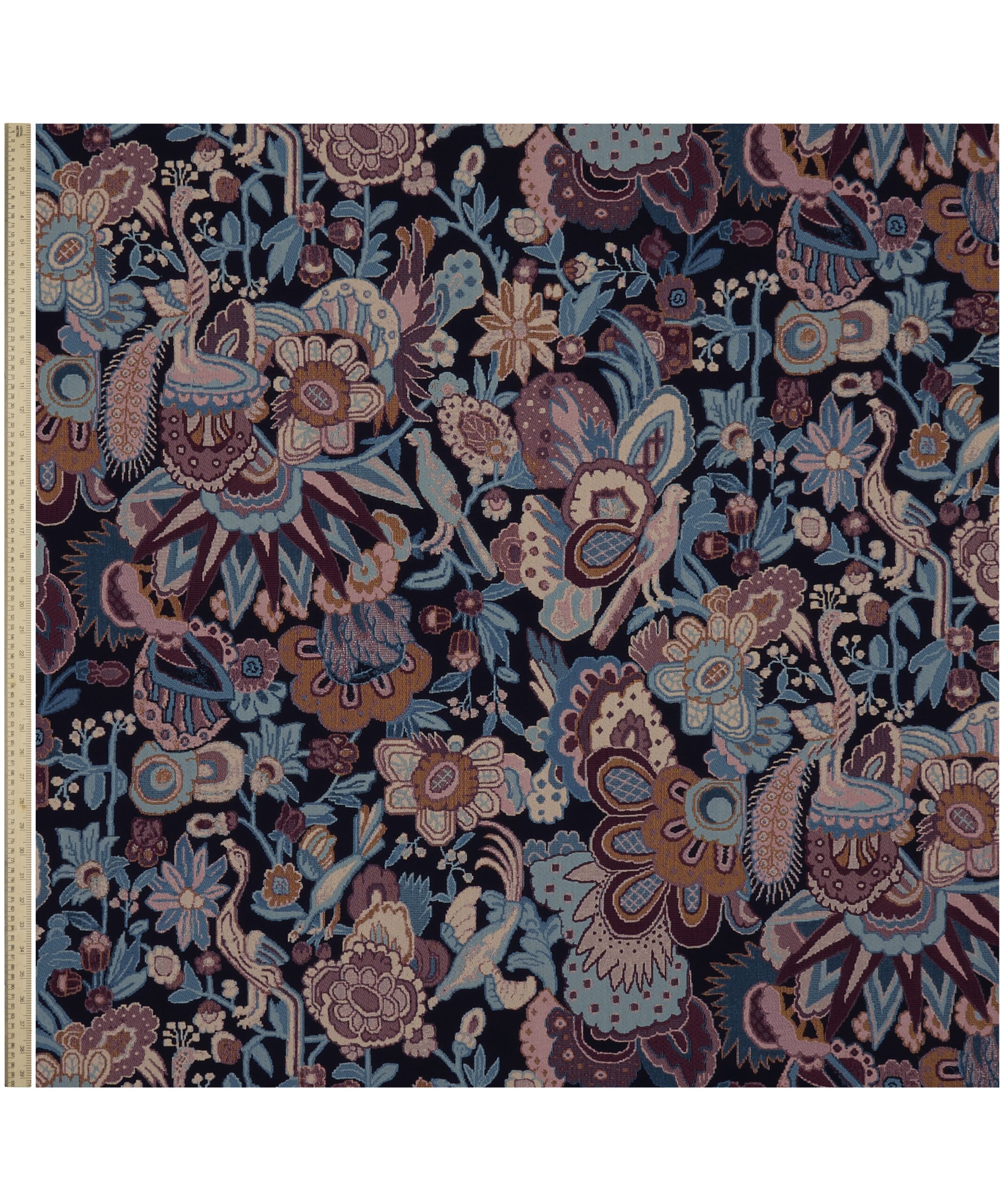 Tapis is based on a hand-painted artwork unearthed in the Liberty archive. Originally printed for the 1991 Liberty furnishing fabric collection, the design evokes a richly hued tapestry, reminiscent of the exquisitely crafted, traditional Persian rugs discovered in the famed Liberty rug salon. Brimming with vibrant flora and fauna, birds and peacocks with their graceful plumage, blend seamlessly into the decorative floral background. Woven with a viscose-polyester blend, Tapis is ideal for drapery, cushions, and accessories.