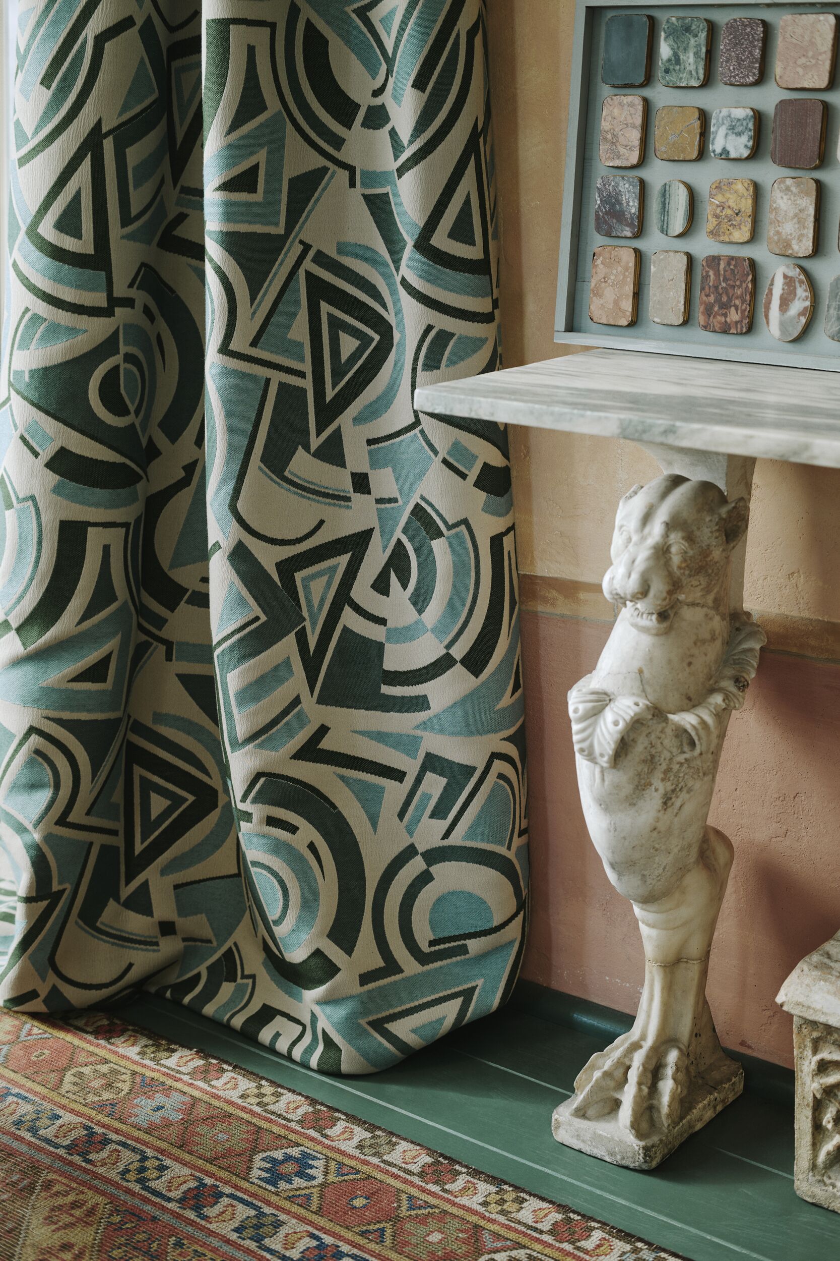 In collaboration with expert textile mills in Italy, Belgium, and India, the subtle textures and details from the artwork have been carefully translated into a beautiful array of woven, embroidered, and printed fabrics. From surprising geometrics, lively abstractions, and rhythmic lines, this innovative Interiors collection combines the designer’s artistic sensibilities with expert craftsmanship.